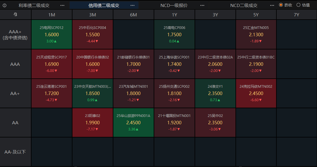 今天信用债的整体表现要比利率债稍好一点,其中短端债券收益率下行幅度相对较大,再加上中长端债券也有不俗的表现。所以信用债的收益率下行幅度普遍比利率债要更大一点。