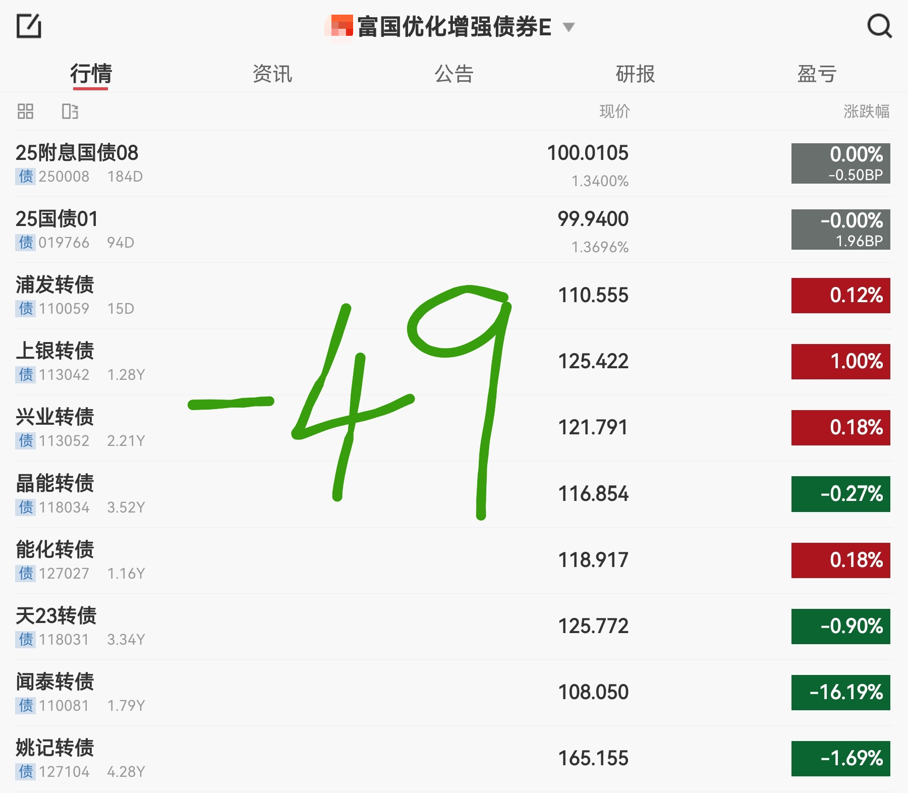 权益和可转债再度拉升,目前富国优化增强债券E的跌幅也是明显缩窄,目前丢49个蛋15。要知道在上午收盘的时候他的跌幅一度突破70。