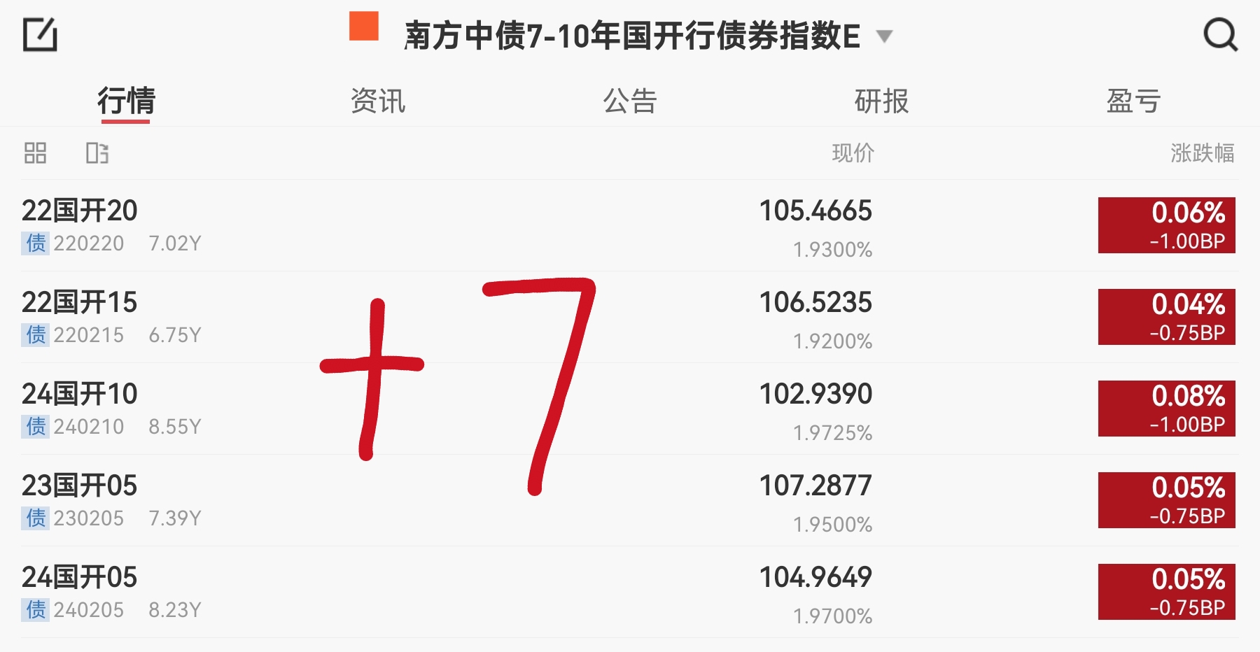 上面已经讲了,今天利率债的行情主要在30年期国债,其他债券涨幅都不大。所以南方中债7-10年国开行债券指数E收蛋量不多,目前收7个蛋3。