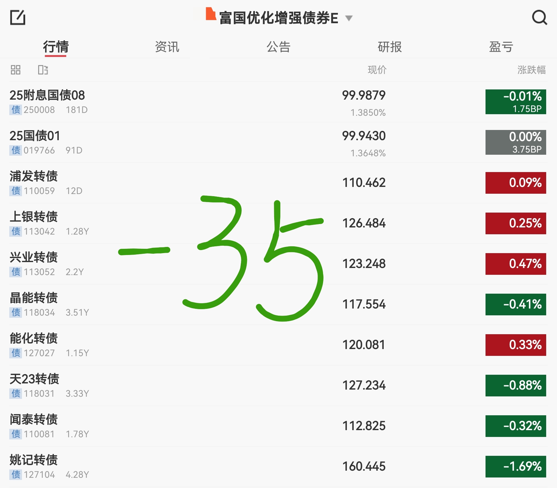 下午盘中权益和可转债继续向下走,所以目前富国优化增强债券E的估值也在扩大,目前丢35个蛋15。