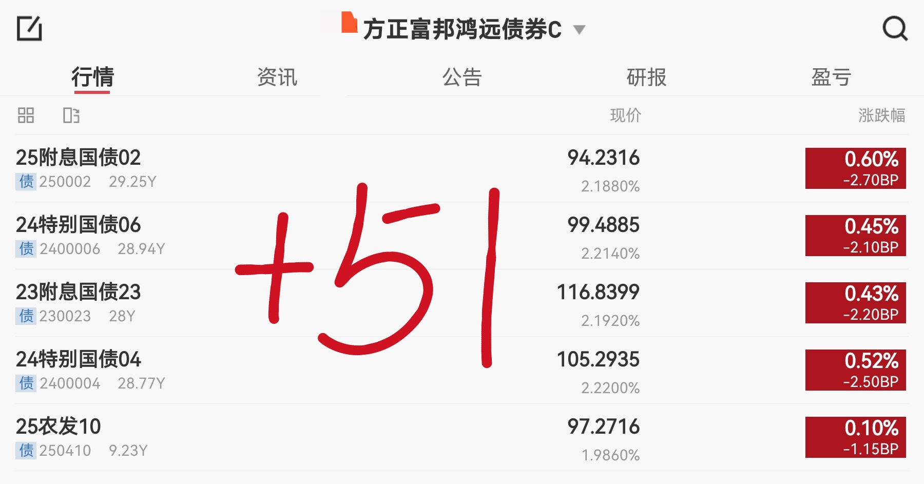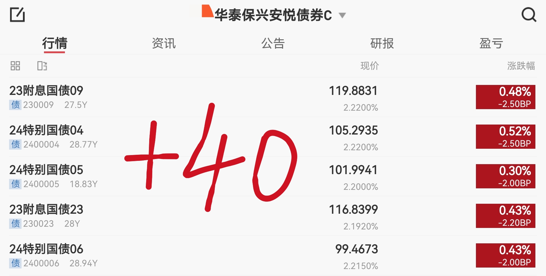 $华泰保兴安悦债券C(OTCFUND|020741)$$富国久利稳健配置混合E(OTCFUND|019370)$$富国优化增强债券E(OTCFUND|018980)$$国金惠盈纯债C(OTCFUND|006760)$$方正富邦鸿远债券C(OTCFUND|015909)$$南方中债7-10年国开行债券指数E(OTCFUND|013594)$$国泰嘉睿纯债债券C(OTCFUND|016604)$