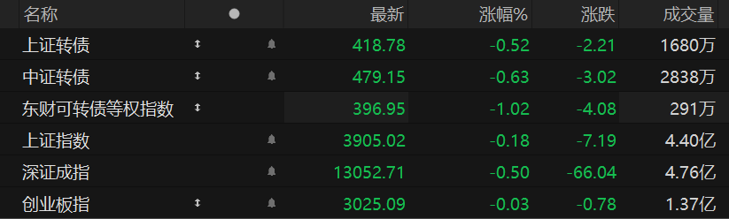不得不说今天权益和可转债的震荡依然很明显,目前两者都处于下行状态,权益市场三大指数目前由红转绿,可转债三大指数跌幅进一步扩大。