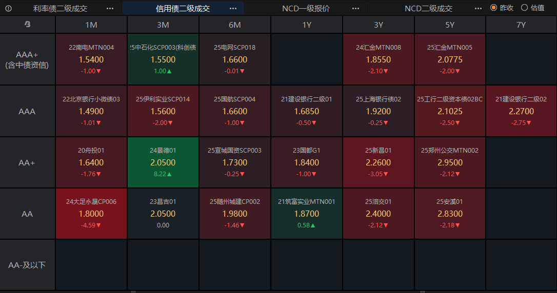 信用债也是越来越强,整个长端债券全部涨起来了,3~7年期债券的收益率下行幅度大部分都在2.00bp以上,如果短端再拉升一点信用债都是大晴天行情了。