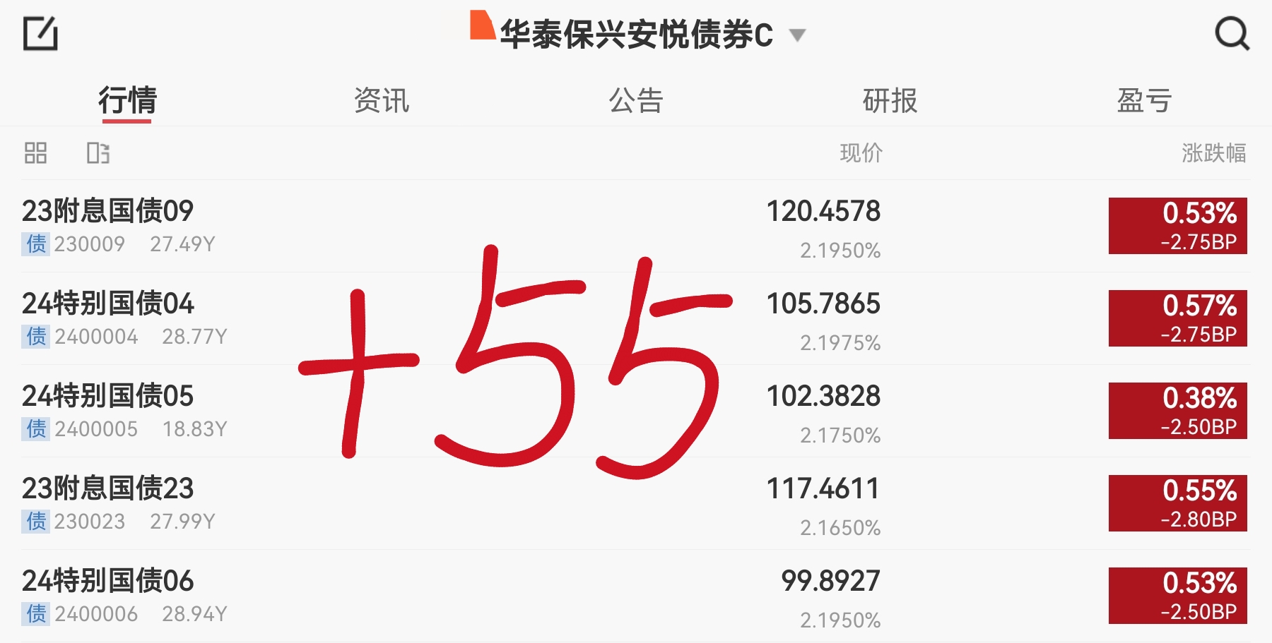 目前30年期国债的次活跃券和非活跃券收益率下行幅度已经接近3.00bp了,华泰保兴安悦债券C的收蛋量也增加至55个5。