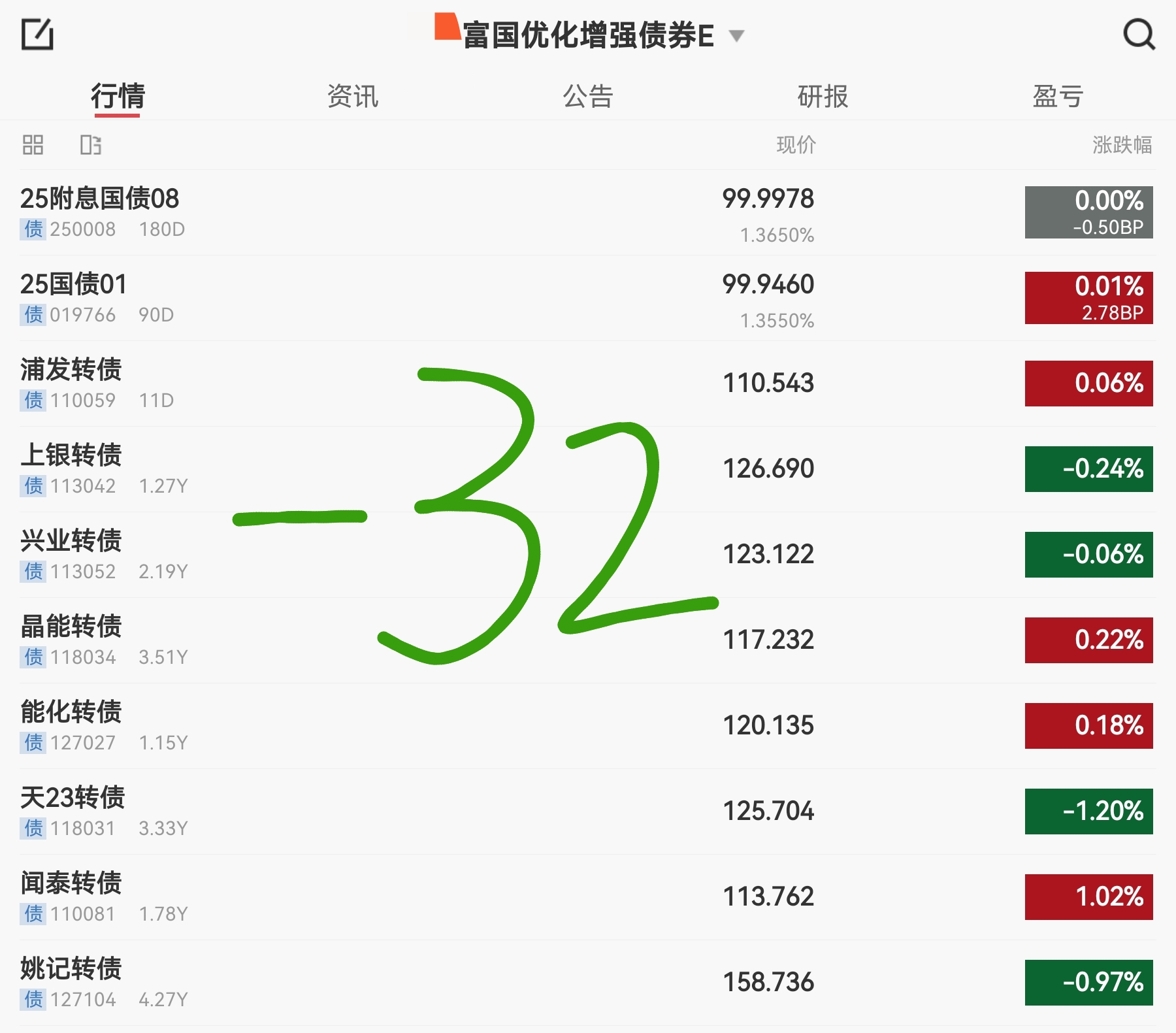 权益和可转债的行情上面已经解读过了,富国优化增强债券E目前丢32个蛋15。