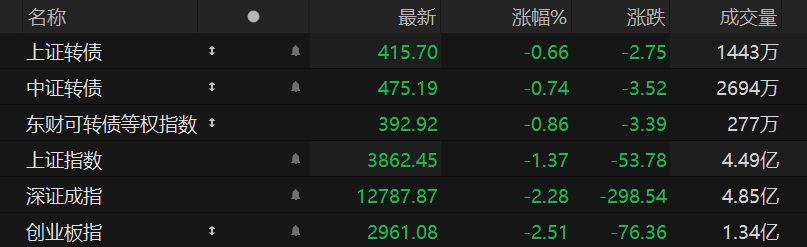 下午盘中权益市场还是以低位震荡行情为主,没有明显的拉升动作,目前来看,权益市场三大指数跌幅依然较大。可转债就更不用提了,权益市场表现不好,可转债的正股就会下跌,下跌趋势也会联动传递到转债,所以目前可转债的跌幅也比较大。具体下跌幅度可以参照下图。