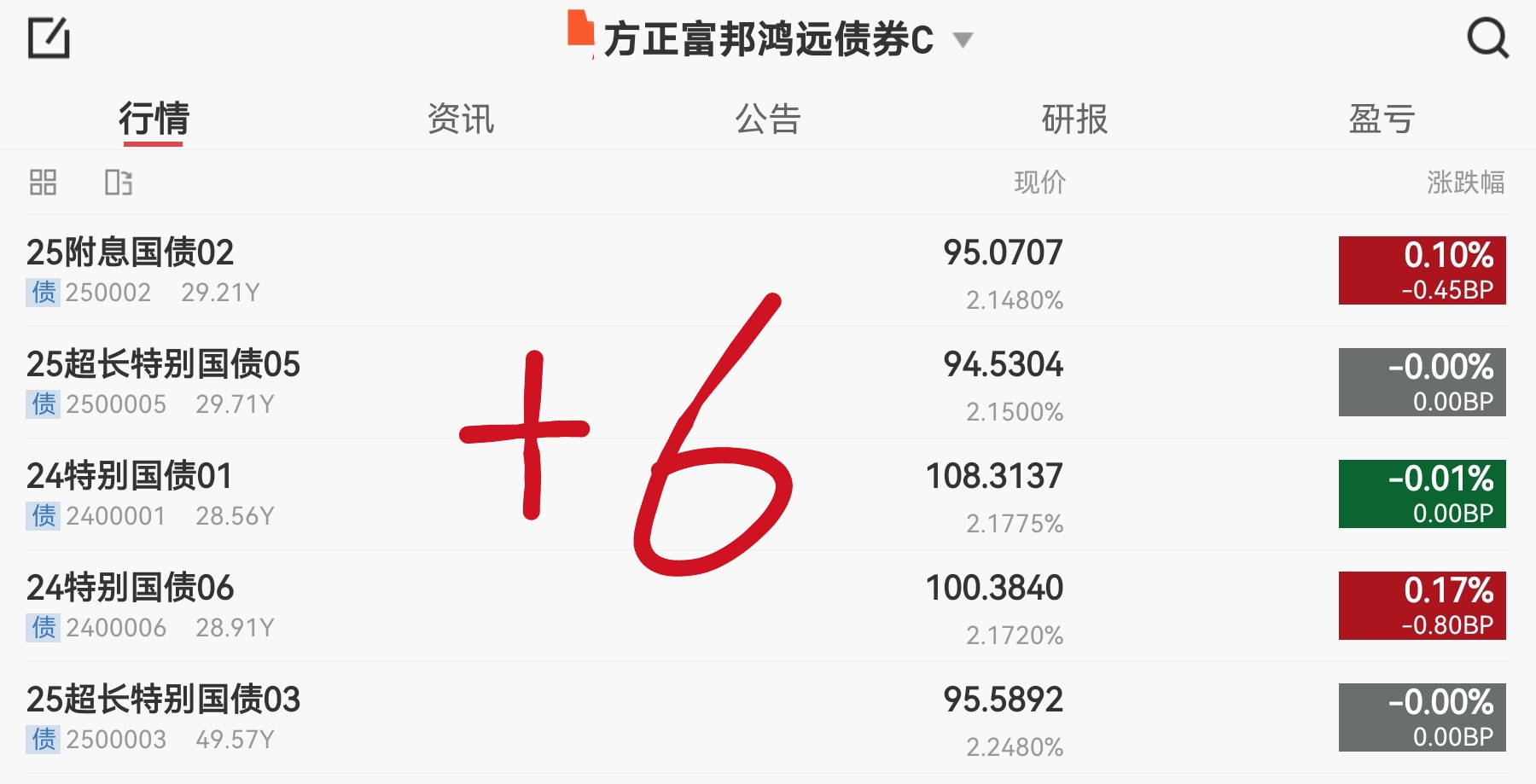 $长城短债C(OTCFUND|007195)$$富国优化增强债券E(OTCFUND|018980)$$富国久利稳健配置混合E(OTCFUND|019370)$$国金惠盈纯债C(OTCFUND|006760)$$方正富邦鸿远债券C(OTCFUND|015909)$$南方中债7-10年国开行债券指数E(OTCFUND|013594)$$华泰保兴安悦债券C(OTCFUND|020741)$