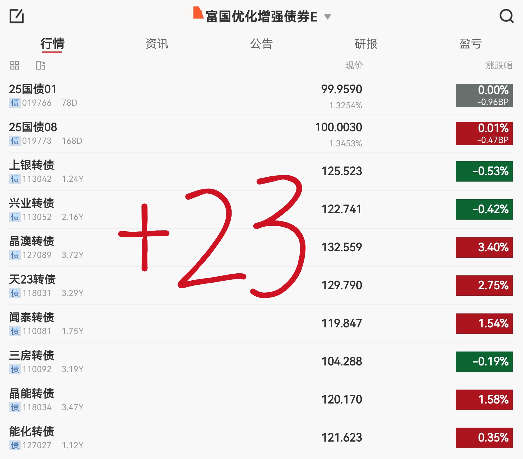 下午盘中权益市场和可转债市场持续上行,富国优化增强债券E估值也有明显拉升,目前收23个蛋15。