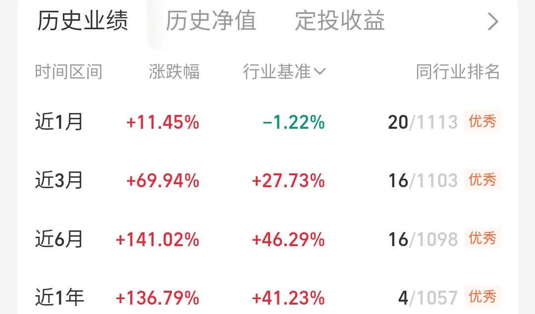 该基金是一只权益基金,也就是大家所说的股基,当前股票持仓占94.49%。基金管理人始终能够锚定政策、市场、技术发展需求,科学合理的布局新兴产业股票。前十大重仓中涵盖了芯片、光通信、高端制造等板块股票,其中还有一部分是行业的龙头。业绩表现也是非常的好,虽然前期有回撤,但是能在较短的时间内快速修复;近一个月收益率达到了11.45%,近三个月收益率达到69.94%。近六个月收益率达到141.02%,近一年收益率达到136.79%。所以今天先上车2000元建个仓。