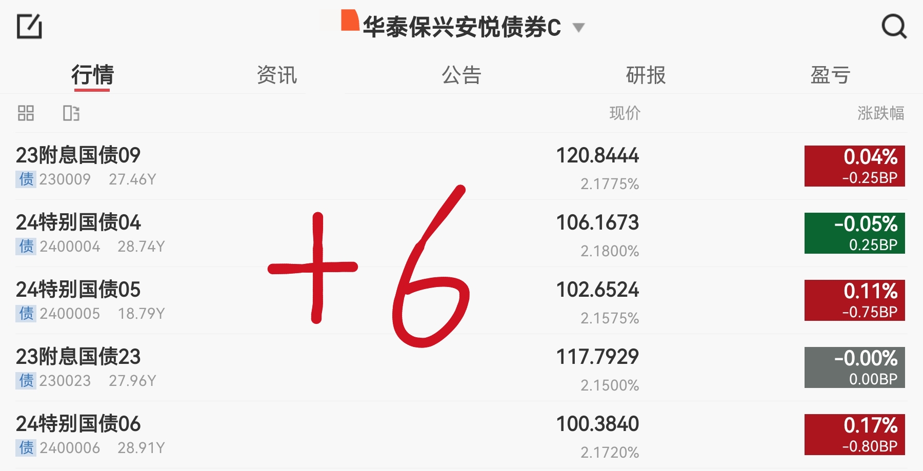 利率债的长端回落比较明显,目前30年期国债的收益率下行幅度仅仅只有0.15bp了。所以华泰保兴安悦债券C涨幅明显缩窄,目前收6个蛋5。