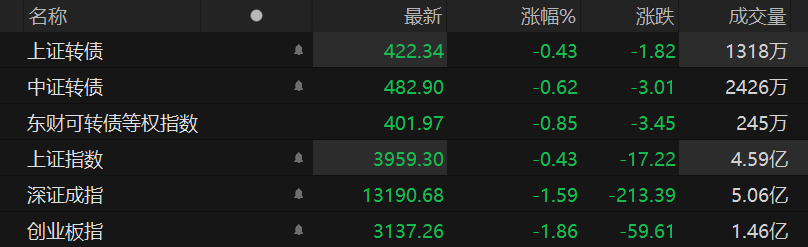 权益市场下午还是处于下行状态,目前已经触及今天的最低点,深证成指和创业板指都跌超1.50%,上证指数下跌0.43%。可转债的行情也不容乐观,目前可转债等权指数下跌0.85%。