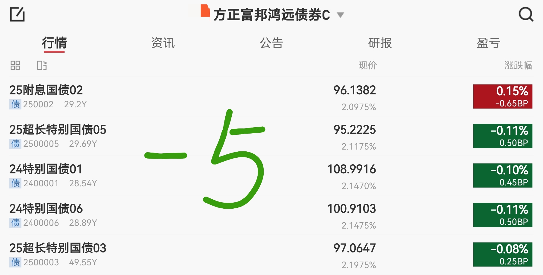 方正持仓中居然有一只债券是红的,250002收益率下行0.65bp,所以它的跌幅就没有华子多。