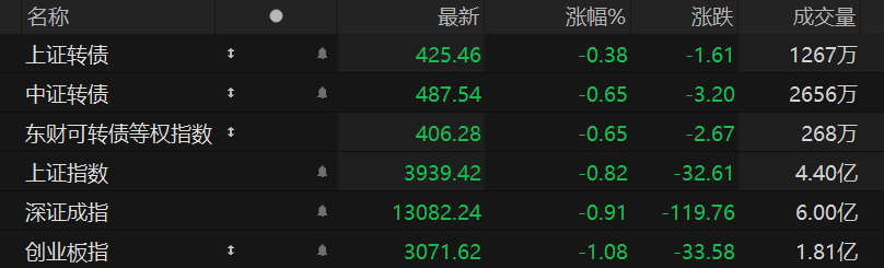 下午盘中,权益市场不仅没有一点上攻的意思,而且还出现了较大幅度的下行,当前创业板指已经跌超一个点,上证指数和深证成指跌幅也扩大了不少;可转债也跟着陷入了被动。今天债券市场整体来说还算可以,三大现券都处于小幅上涨状态。