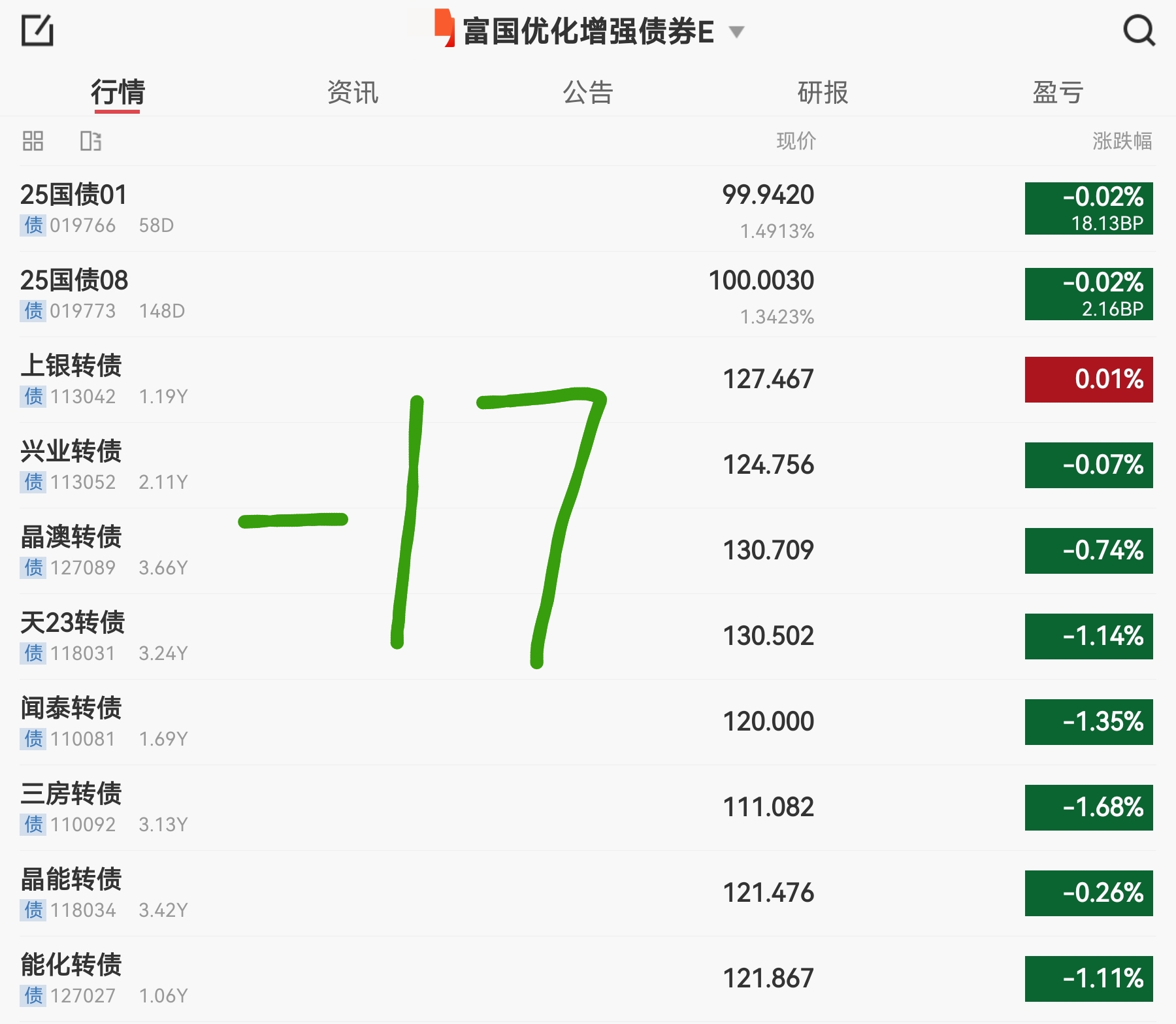 盘中权益和可转债出现了非常明显的下行,所以富国优化增强债券E跌幅也随之扩大,目前丢17个蛋15。