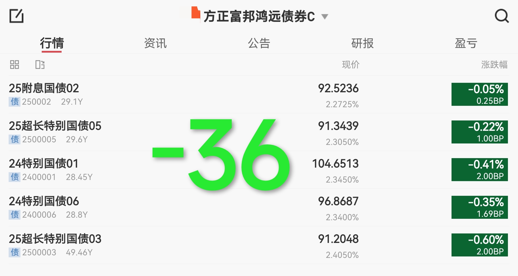 下午利率债的这一波拉升幅度还是非常大的,尤其是30年期国债,部分债券的跌幅缩窄了一半以上。所以该债券基金的跌幅也是明显缩窄,丢蛋量从70缩窄至36。