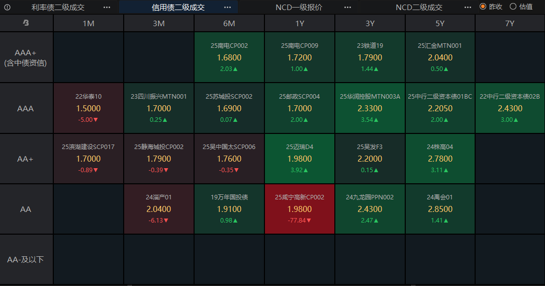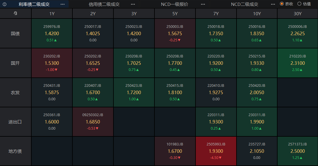 从成交矩阵图来看,反应就更加清晰了,短端已经有债券开始翻红了,中长端债券幅大幅缩窄。