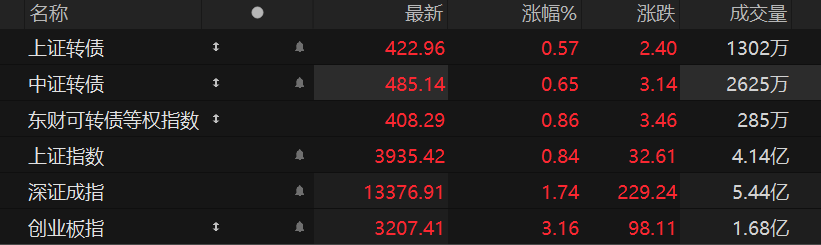 下午盘中权益市场表现依然很强势,涨幅还在慢慢的扩大,目前上证指数的涨幅已经接近一个点了,而创业板指的涨幅已经达到了3.16%。从涨幅上来看,今天可转债是跟着上证指数走的,所以整体来看,可转债的涨幅远远没有权益市场那么大,就拿涨幅最大的等权指数来说吧,目前涨幅还不足1个点。