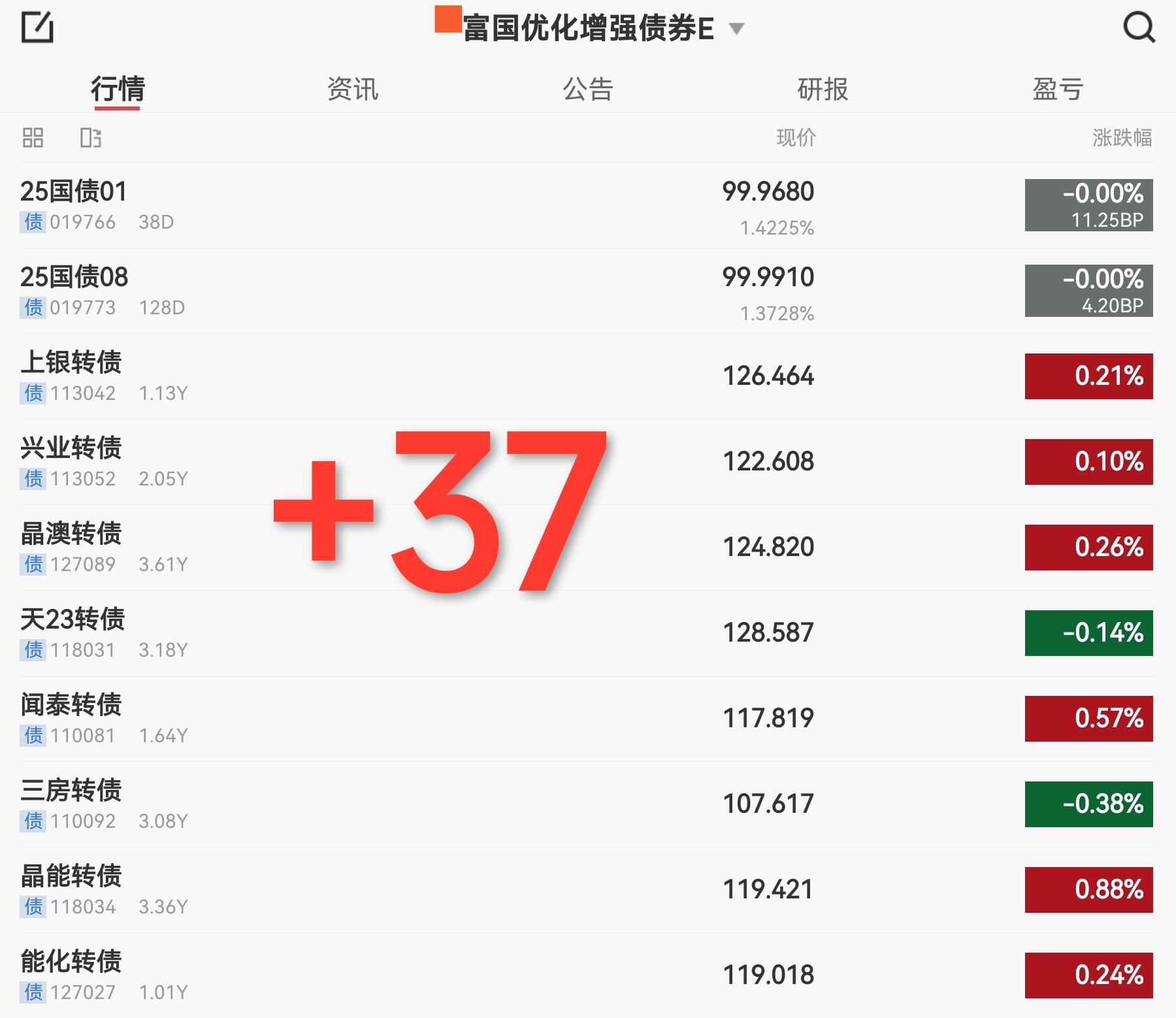 下午盘中权益和可转债又有一定程度的拉升,所以富国优化增强债券E的估值也是更进一步,目前收37个蛋。
