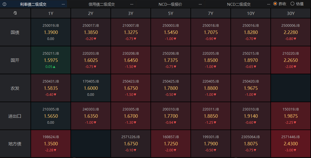 今天利率债的整体表现还算均衡,大部分债券的收益率下行幅度集中在0.50bp到1.10bp之间。目前依然保持全面上涨状态。