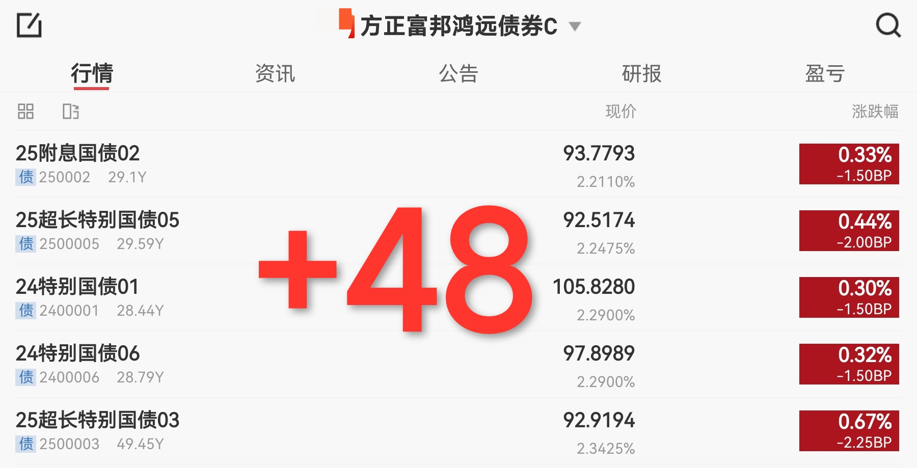 这只债券基金跟其它超长久期利率债基金不太一样,它的持仓中不仅有30年期国债,而且还有一部分50年期国债,所以久期更长,弹性也更好。该债券基金已经连续三天上涨了,说实话,之前没有加仓这只债券基金有点后悔了,但是它已经涨起来了,我还是以观望为主吧,今天不加仓。
