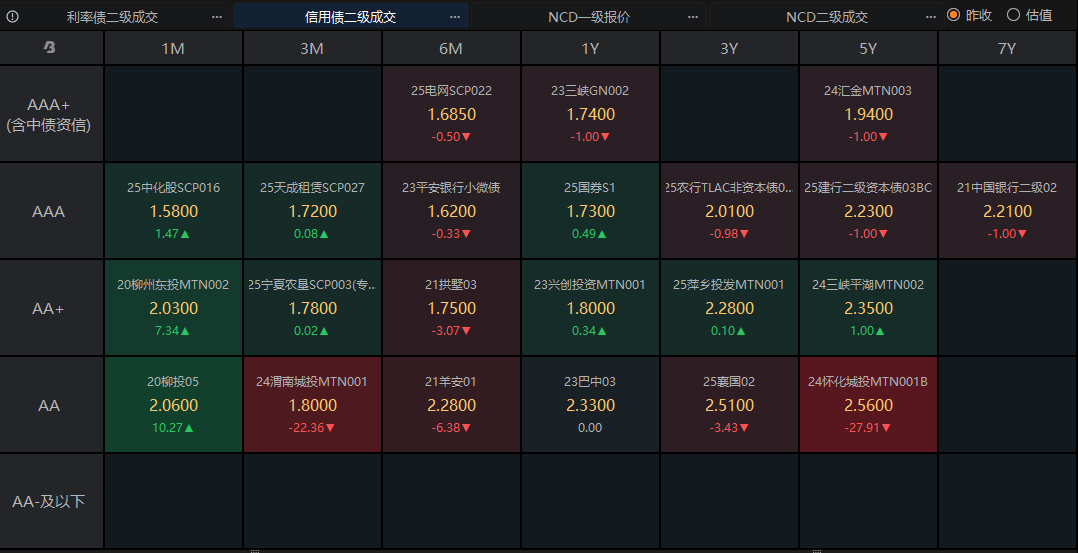 今天我多次在文中强调信用债走势偏震荡。从券种角度来看,不稳定因素还是在于城投债,目前来看矩阵图上的大部分下跌债券都是城投债;银行债继续稳定发挥,表现较好。产业债盘中表现还是非常出色的,与昨天相比,行情要好很多。