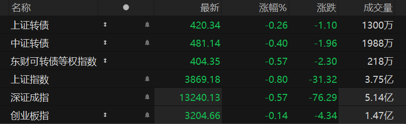 下午开盘以后,权益市场持续下行,目前三大指数已经集体翻绿了,上证指数跌幅相对较大,跌幅达到了0.80%。可转债的表现也不好,目前来看,等权指数跌幅较大,跌幅达到了0.57%。