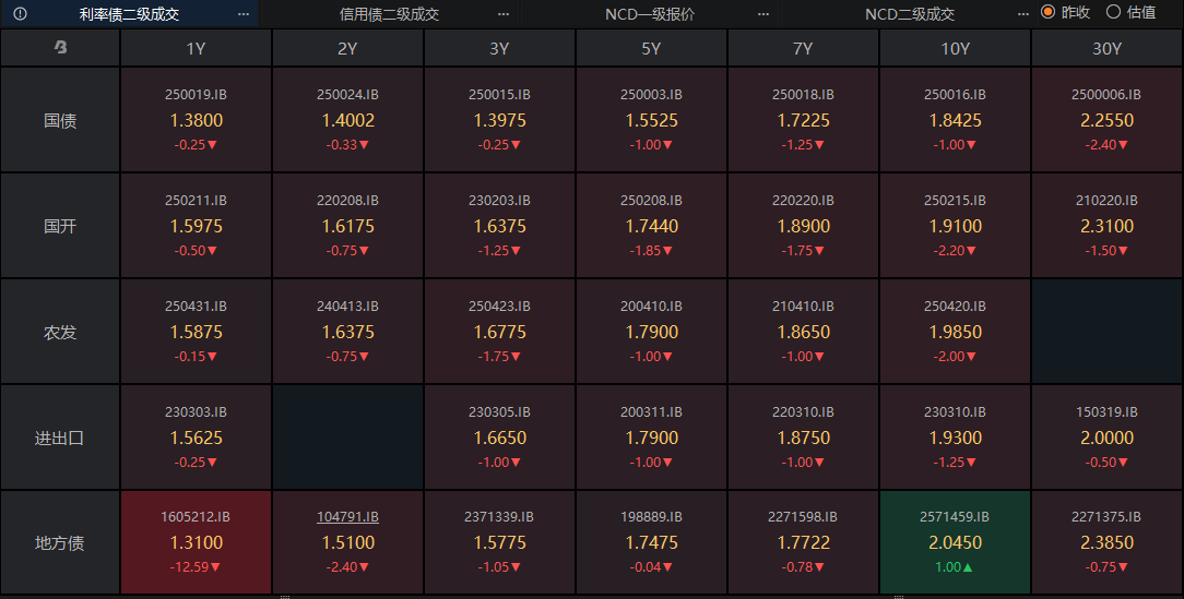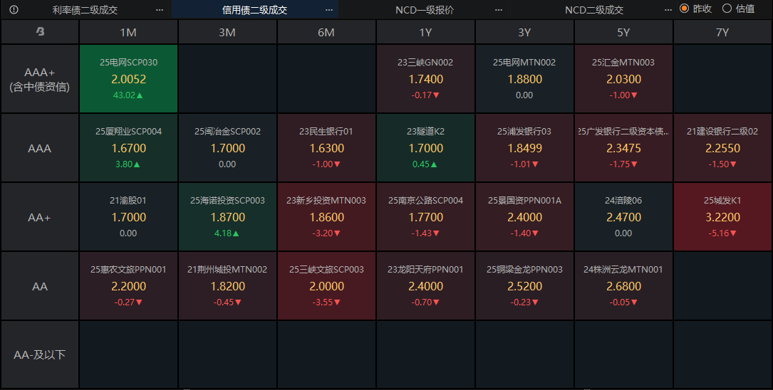 国债和政策性金融债还是满屏红,目前来看,大部分3~30年期债券收益率下行幅度都在1.50bp以上,已经迈入大晴天行情了。