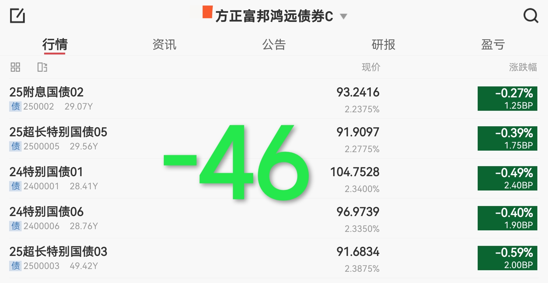 这只债券基金的持仓中不仅有30年期国债,而且还有一支50年期国债,这是50年期国债的久期大概在32年左右,所以也拉长了它的平均久期。该债券基金没有什么好说的,因为下午30年期国债的收益率一直处于上行状态,所以说该债券基金的跌幅也是越来越大。