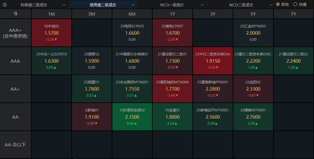 利率债持续下行,目前下跌趋势正在向短端蔓延,目前来看只有一年期债券保持全红,2~3年期的政策性金融债也开始下跌翻绿了。5~30年期债券目前大部分都是下跌状态,并且30年期国债收益率上行幅度相对较大。