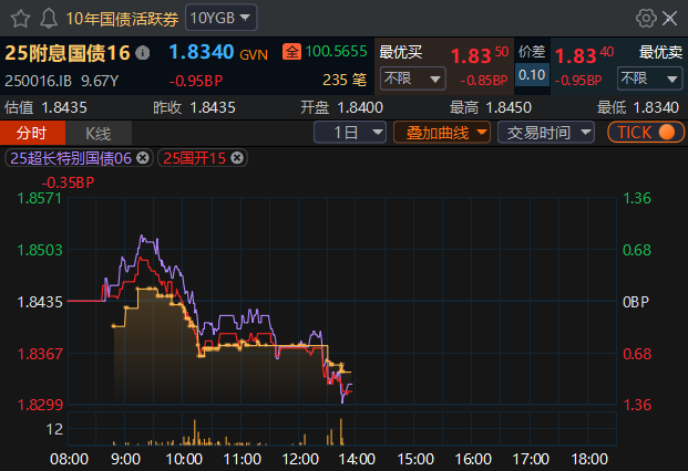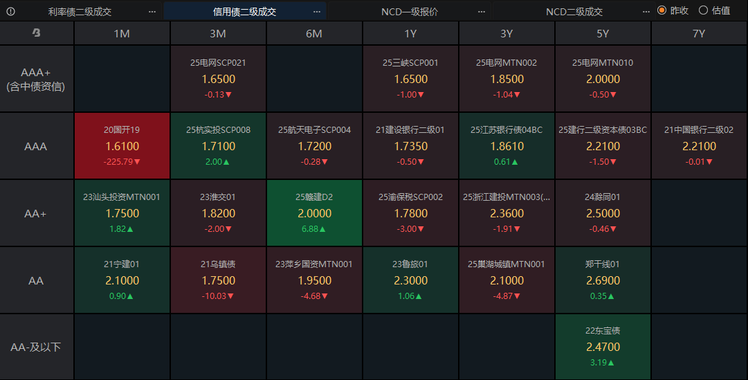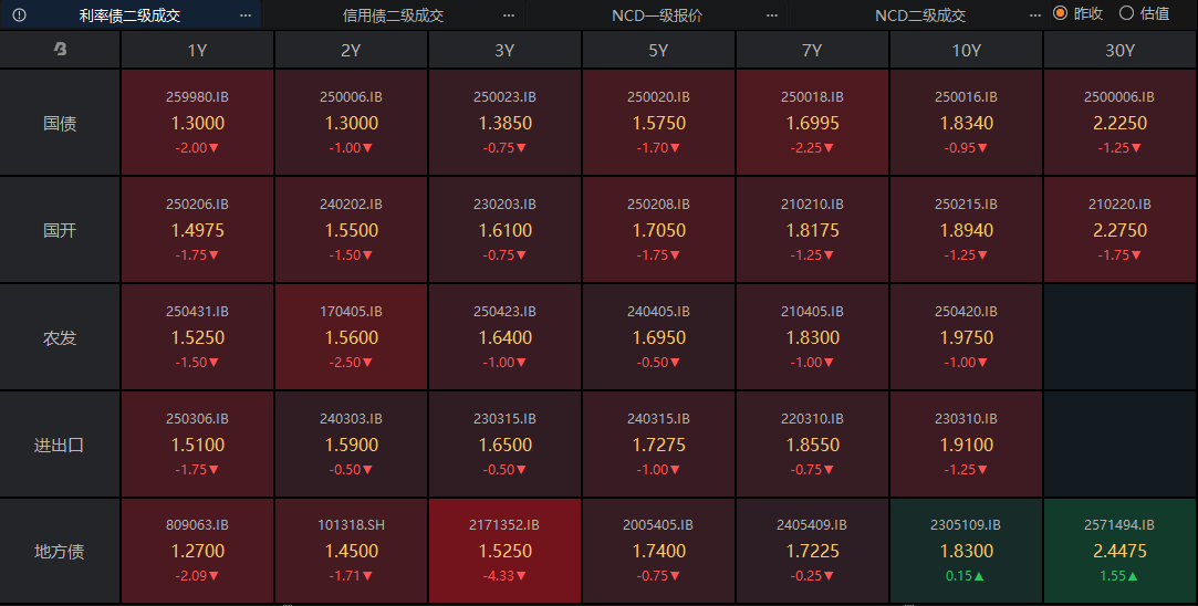利率债一直在拉升,目前大部分成交债券的收益率下行幅度都在1.00bp以上。从当前盘面来看,长端和短端的行情基本上处于平衡状态了,收益率下行幅度相差不大。