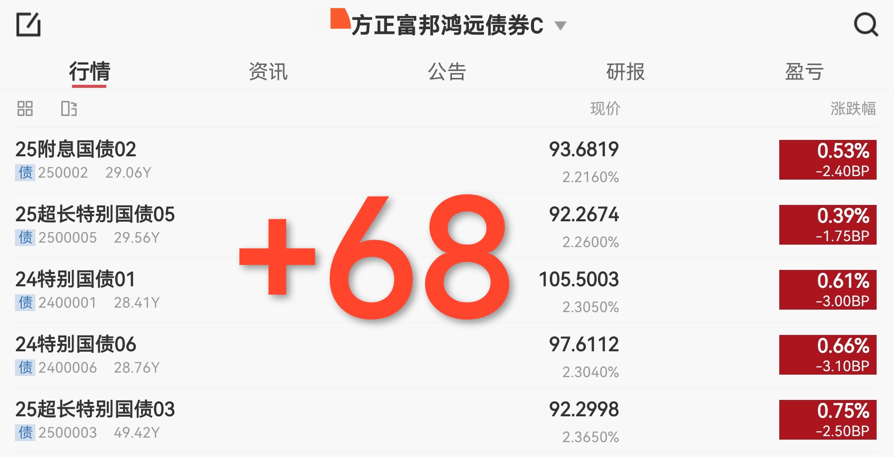 这只基金今天表现非常强势,目前涨幅也比较大,所以对于这只债券基金来说,我今天还是不动了,不加也不减。通过下图大家可以清晰的看到,这只基金的持仓中有一只50年期国债,目前涨幅比较大,涨幅达到了0.75%,正是因为有了这只债券才拉开了它与华子的差距。