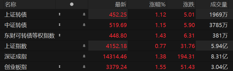 今天权益市场再度上涨,沪指迎来17连阳,等权指数表现依旧强势,所以今天可转债表现很强,大家通过下图也看到了,目前可转债已经是SS+行情了。债券市场这边整体来说还算可以,除了同业存单小幅回调以外,利率债、信用债、国债期货目前都是小幅上涨状态。