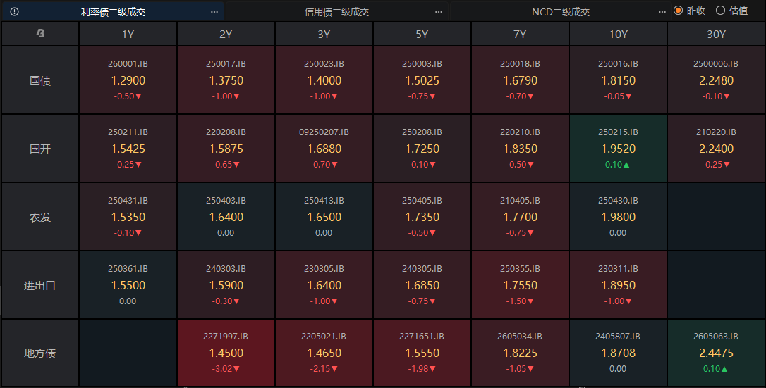 目前利率债处于缓慢回落状态,长端债券已经开始绿了,最先绿的是10年期国开债活跃券。中短端债券变化不大,整体还算稳定。