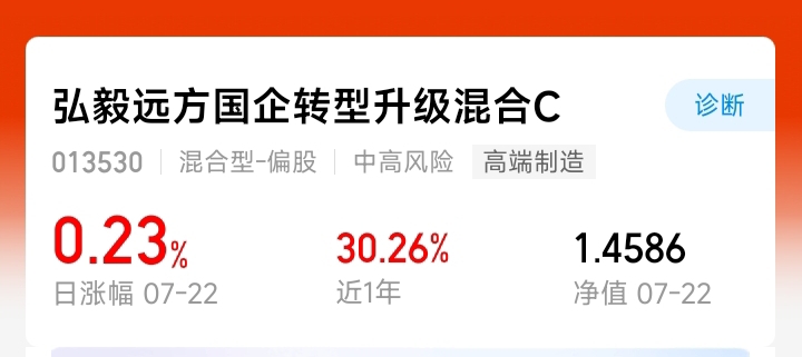 真猛啊,大盘快到3600点了,上涨趋势不变,$弘毅远方国企转型升级混合C$目前估值0.9%,昨天上涨0.23%,近一年涨超30%,这收益瑶瑶领先啊,基金经理季报重点看好医药板块,远方国企里面也有医药,我觉得现在布局还不晚,可以关注起来咯!