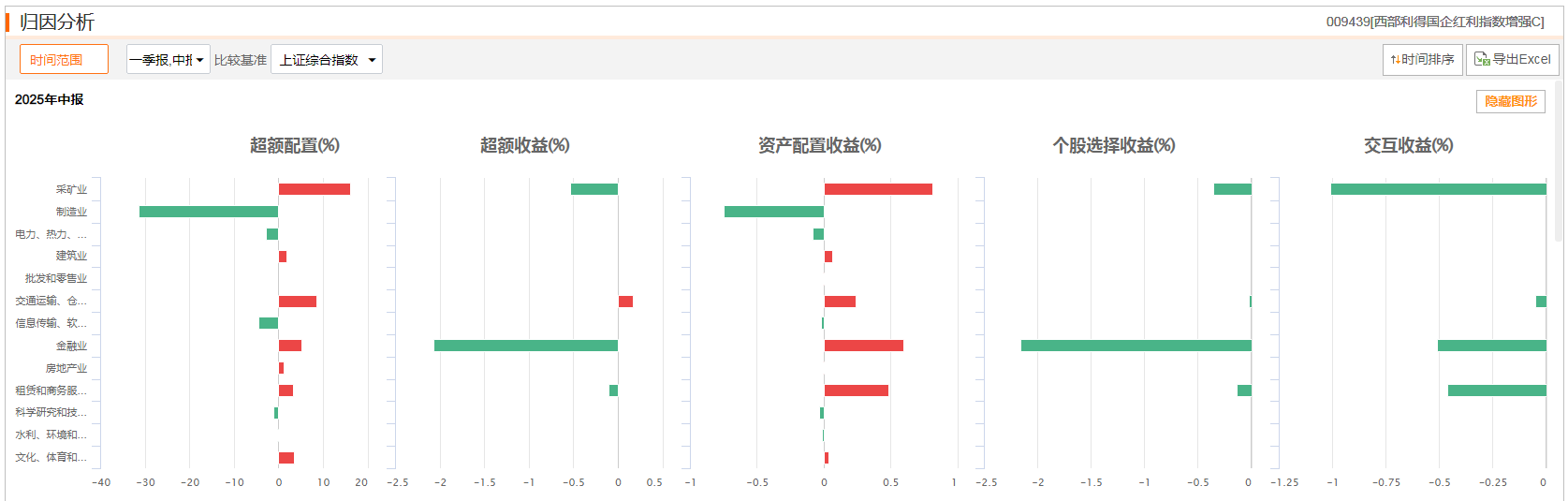 中期业绩层面,基金近1年净值增长率为10.97%,大幅超越同类增强指数型基金平均47.02%的表现。这种相对保守的收益特征与基金高股息定位相关,其持仓结构中金融业(25.4%)、采矿业(19.91%)等低波动行业占主导。从归因分析看,2024年至2025年期间,基金通过"周期红利+估值修复"双轮驱动策略,在煤炭、银行板块获得稳定股息收益的同时,捕捉到部分周期股的估值修复机会,推动年化收益率维持在10.46%水平。