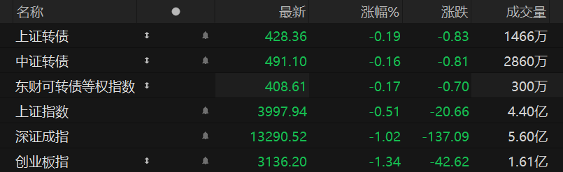 权益市场回调还是比较明显的,加权指数持续下行,等权指数也出现了比较明显的回落,目前在零轴附近。可转债的行情基本上跟等权指数保持一致,也是处于小幅下跌状态,跌幅都在0.20%以内。