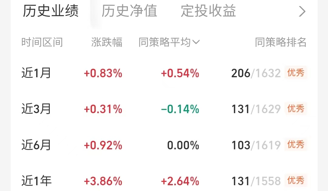 前期权益和可转债出现了非常明显的调整,长信利保债券C也受到了一定程度的影响。这一过程中我不仅没有跑路,而且还在低位适当加仓。实践证明,我的做法是正确的。行情回转之后快速扭亏为盈,目前持有收益率已经达到了0.30%,持有体验还是很好的。由此可见,对于固收+基金来说,遇到回调逢低加仓才是正确姿势。