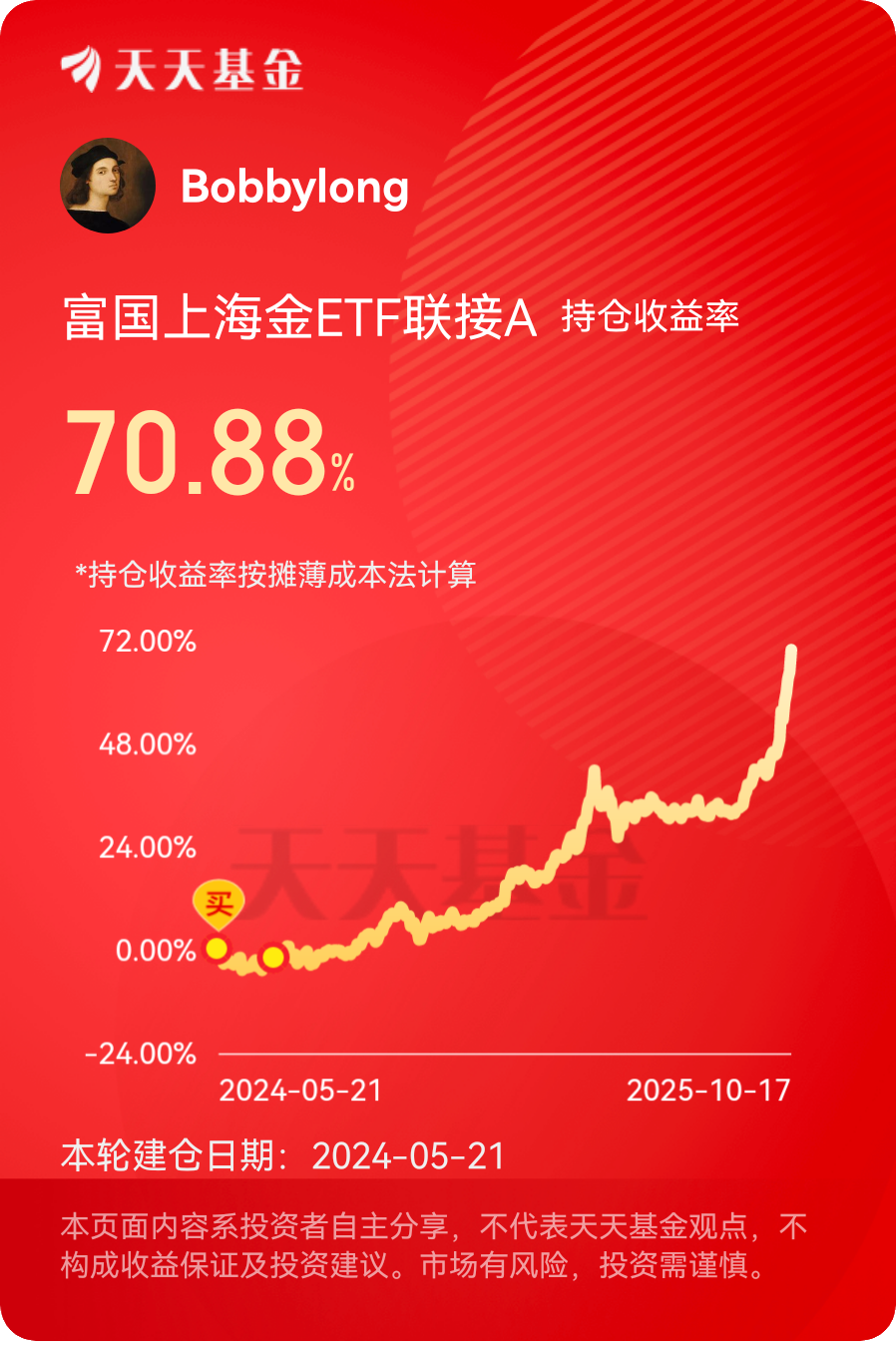 看多机构不少,黄金上涨趋势很好,别看眼下它已经在历史高位附近晃悠了,但是背景没变,要知道今年以来,国际黄金价格可是一路往上冲,压根没怎么歇脚。$富国上海金ETF联接A$ #晒收益#