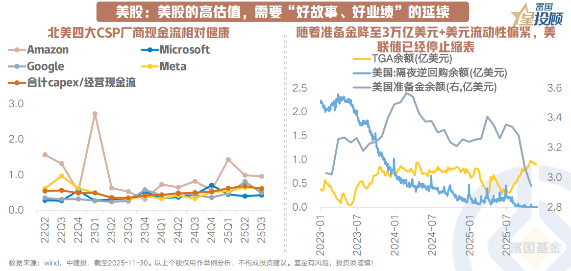 1)从流动性环境来看,短期利空注意日本加息声音下日元套息交易反转,美股或在估值高位和经济数据不明带来的降息分歧等双重压力下继续震荡。好在降息节奏摇摆不改降息周期趋势,与明年“大美丽”扩张打好“财货两宽”的配合以及美联储停止缩表等行为或暗示美国扩容“水池”的必要性不改。