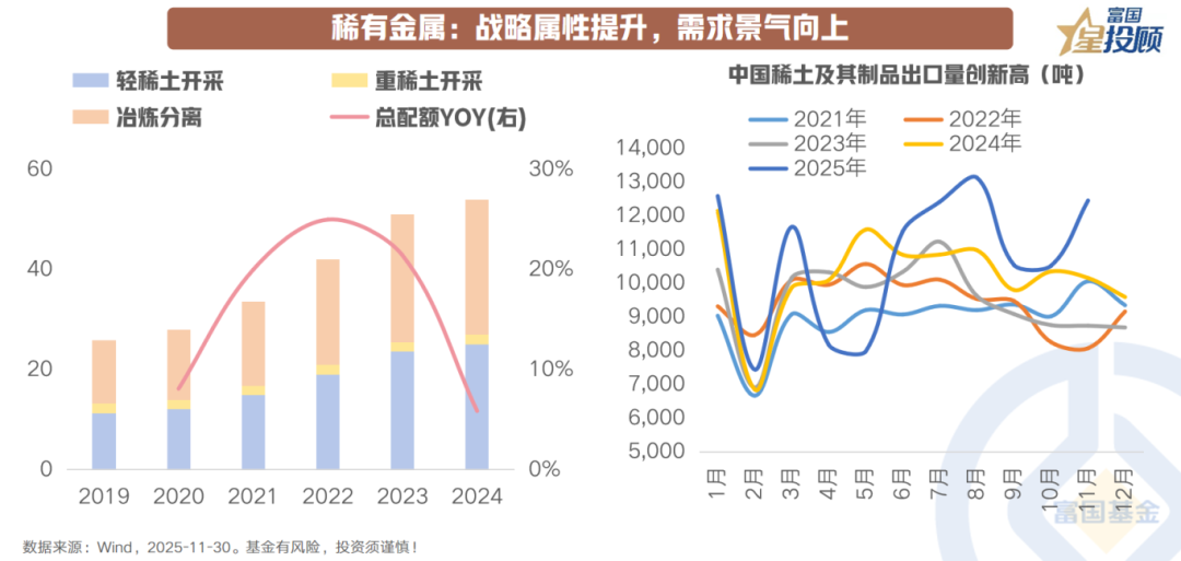 去全球化背景下,稀有金属的战略属性持续提升,需求端景气度稳步向上,行业迎来价值重估机遇。2024年10月,《稀土管理条例》的施行标志着稀土行业进入规范化管理的新阶段,国内稀土开采配额增速下降、缅甸矿进口受限,中长期紧平衡格局进一步强化。需求端结构持续优化,稀土消费逐步转向新能源与高端制造等新领域,稀土永磁材料在新能源汽车、节能电机、人形机器人等领域需求旺盛。当前国际局势复杂多变,地缘政治博弈加剧,稀土等战略资源重要性凸显,中美博弈下定价权竞争升温,板块战略价值凸显,估值具备上行空间。