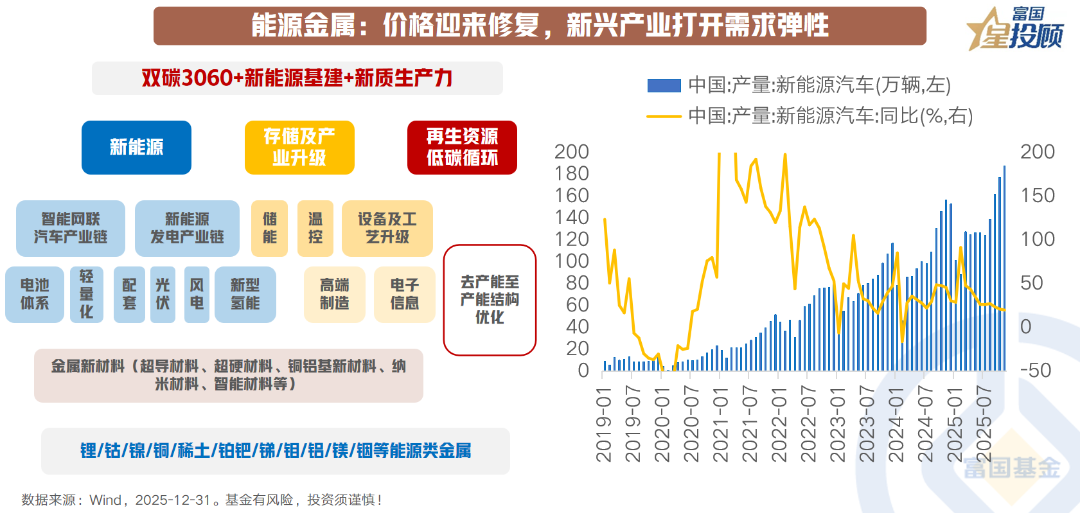 能源金属年内表现突出主要受益于供给端约束、需求端结构性扩张与价格端修复的共振。2025年碳酸锂价格走出反转行情,核心驱动力来自新能源汽车与储能两大终端的持续高景气。作为锂金属消费的最大下游,新能源汽车产销维持强劲增长,2025年1-11月,我国新能源汽车累计产量达1487万辆,渗透率稳步提升;全球储能装机超预期放量,对碳酸锂形成刚性且具弹性的需求支撑。供给端,国内锂矿资源监管政策收紧与生产扰动、国外锂矿产能复苏较慢共同限制供给弹性,碳酸锂价格中枢明显上移。钴金属同样迎来明确的上涨周期,其核心驱动来自全球最大的钴供应国刚果(金)实施的出口配额管理制度,供给收缩与需求增长共振,推动钴价步入上行通道。展望未来,能源金属的定价逻辑已深度融入产业绿色转型与供应链安全的宏观叙事,锂、钴等关键金属不仅具备周期属性,更日益凸显其战略资源价值。