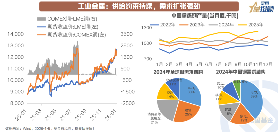 2025年,工业金属板块在“供给约束持续,需求扩张强劲”的双重驱动下,呈现相对紧平衡格局。供给端,矿产端扰动事件频发,铜矿新增产能释放有限,上游资本开支长期不足的影响逐步显现,供应短缺从预期走向现实;需求侧,电力基建、新能源及高端制造等领域需求具备较强韧性,为金属价格提供基本面支撑。同时,全球铜库存结构分化加剧,受加征关税预期的影响,市场出现跨市套利与抢运行为,COMEX与LME铜价价差阶段性走阔。整体来看,铜供给弹性受限,需求增长强劲,推动价格中枢持续上移。铝市场亦呈现供需偏紧格局,国内产能约束强化供给刚性,而新能源、建筑及出口需求共振复苏,推动铝价长期趋势向上。2026年,在矿端约束难解、需求延续高景气、宏观流动性改善与政策发力共振下,工业金属延续强势运行的条件仍相对充分。