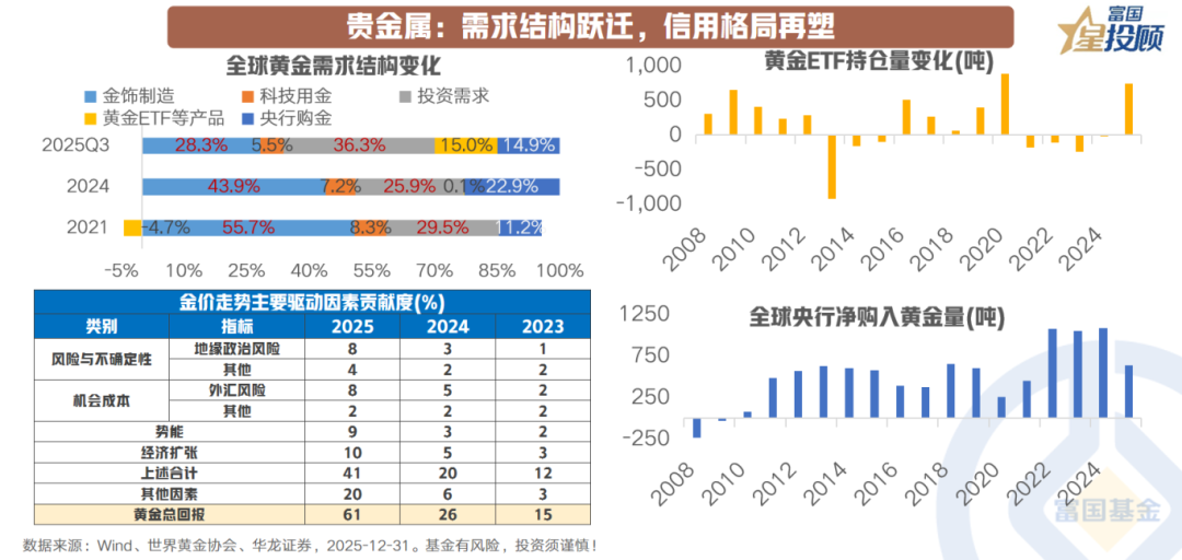 与此同时,金价的核心驱动正在经历“信用格局再塑”的重要变化。传统框架强调美元实际利率作为持有黄金的机会成本,然而,2025年金价的强劲上行已难以完全由经济势能或机会成本因素解释。世界黄金协会数据显示,地缘政治风险溢价及其他非传统因子对金价走势的贡献度显著提升,而传统宏观变量的解释力相对弱化。