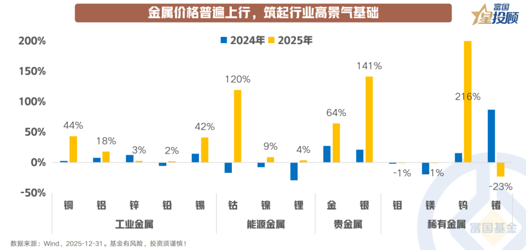2025年,金属价格普遍上行,为有色金属行业高景气度奠定坚实基础。工业金属方面,受益于全球制造业复苏、绿色基建加速及供应端扰动,铜价全年上涨44%,锡价紧随其后上涨42%。能源金属表现整体强势:钴价因供应收紧与电池高端化趋势推动,全年上涨120%;金属锂微涨4%,而碳酸锂作为锂电产业链核心原料,录得约58%的涨幅。贵金属则在多维因素驱动下大幅走强,黄金价格上涨64%,白银更因兼具工业属性与金融属性而上涨141%。稀有金属中,钨价表现亮眼,其他小金属多呈现结构性行情。总体来看,金属价格的广泛上涨不仅反映了全球流动性改善与政策支持的宏观环境,更深层次体现了科技升级与资源安全逻辑下的供需再平衡。同时,价格上行筑起行业高景气基础,为上游资源企业盈利修复与估值重塑提供了强劲支撑。
