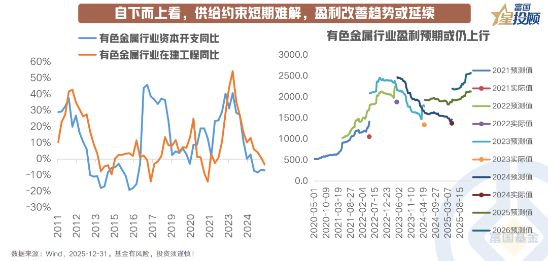 当前有色金属行业供给端约束在短期内难以显著缓解。一方面,行业整体资本开支与在建工程同比增速持续处于低位,叠加新建项目投产周期较长,新增有效产能释放有限;另一方面,资源国政策收紧、地缘政治风险等外部扰动因素仍在延续,进一步制约了供给弹性。需求端方面,受益于全球经济温和复苏与产业升级进程加速,有色金属下游需求扩张趋势稳固。在供给端约束未松、需求端量价齐升的格局下,行业盈利修复趋势有望延续。同时需注意的是,地缘不确定性、美联储降息节奏波动与全球经济复苏不及预期等因素可能为板块带来波动,供需错配更显著、行业附加值更高的领域或具备更强的盈利改善韧性。