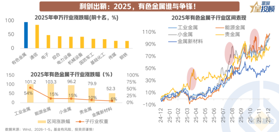 2025年科技热潮席卷全球,有色金属板块则悄然崛起,成为科技主线之外的另一把“利刃”,展现出强劲的弹性。截至年末,有色金属行业以94.7%的年度收益登顶申万一级行业涨幅榜,成为全年市场最瞩目的明星板块之一。分领域来看,有色金属各子板块全面开花,交出亮眼答卷,其中工业金属与能源金属板块表现尤为突出,全年涨幅实现翻倍,成为行业整体走强的核心支撑。从区间表现维度观察,各子行业涨幅呈现共振与差异并存的特征,整体上,有色金属行业的强势仍根植于结构性供需错配、美元流动性边际改善以及国内外经济修复对上游资源品的支撑。此外,贵金属在地缘政治风险升温与美元趋弱背景下阶段性走强,小金属则因高端制造与国际战略资源的需求提升而获得重估。