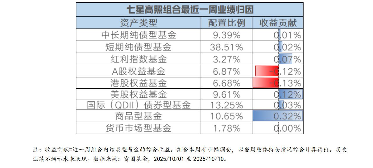 从组合的思路去看:1)国内债迅速修复,在债券市场不空的逻辑下仍是配置的“压舱石”,但也要关注股债跷跷板对收益的压制,当前仓位主要集中在短债上。2)目前在港股和A股的配置上较为均衡,且风格上以红利+科技+军工+农业的配置为主。近期的波动主要集中在前期上涨较好的科技品种上,红利类的修复对于组合的回撤形成较好控制力量。3)低配的美股出现大幅波动,目前来看高估值需要“好故事、好业绩”驱动,未来的波动或将加大。以波动思考当下若出现大幅波动,则有可能出现“抄底”的机会。4)降息预期发酵以及中美摩擦升级的背景下,黄金对组合形成贡献;5)美债收益率下行,美债的长短均衡配置下,是对国内债收益率是有效的补充,胜率较高逐渐走向收获。基于此,七星高照组合当前仍处于稳健运行中。