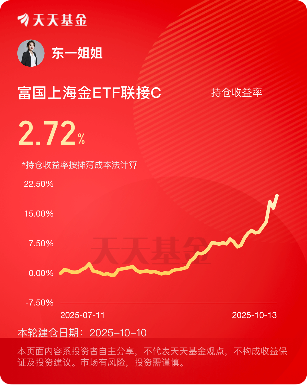 金价涨太猛,可能有回调压力,但长期逻辑依然坚挺!我买入的$富国上海金ETF联接C$ 基金已经在赚钱的路上了,后市如果有回调,就是我继续分批布局的机会!