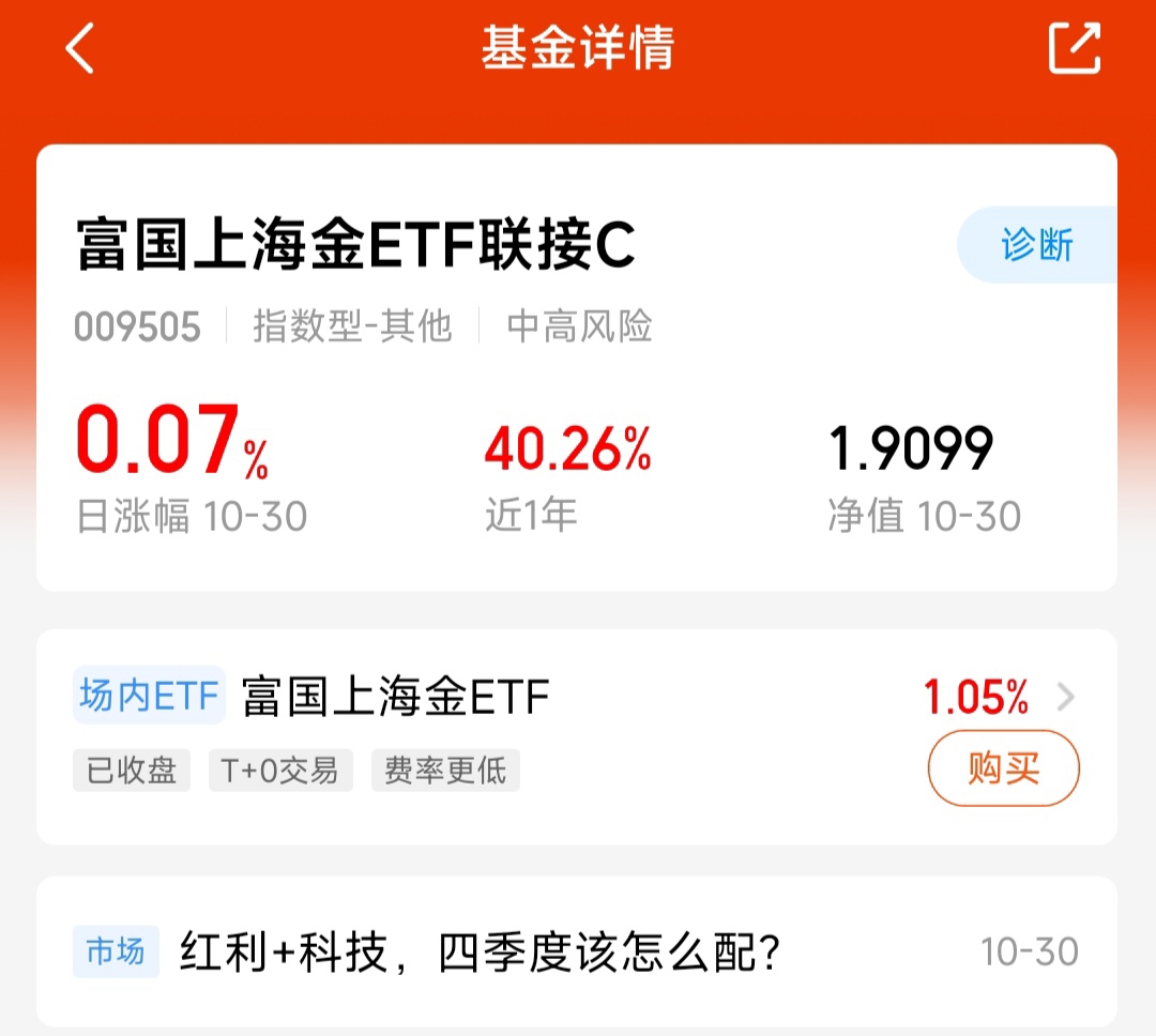 市场又是一片绿,但黄金却红了!面对权益市场的持续震荡和三大指数的集体回调,黄金实现了逆势上涨。这波反弹,不仅显示了避险资金的强大实力,也让我们看到了机会——黄金当前已在3900美元以下,估值还可以。$富国上海金ETF联接C$ 昨日净值逆势微涨0.07%,今天估值则大涨1.08%,而放眼近一年,其涨幅已超过40%,业绩相当扎实。在琢磨不透的行情里,黄金用短期抗跌和长期能涨的表现很满意,今天继续布局。