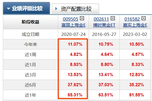 这款基金紧跟上海金价格走势,近1个月涨幅达8.93%,近3个月涨13.53%,近6个月涨37.62%,近年涨165.31%,远超同类不少产品。对比下面热门黄金基金的各个阶段时间涨幅,可以看得出来优势还是很明显的。